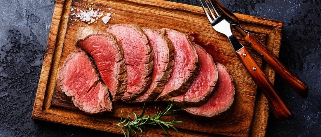 To know when it’s done without a thermometer, press the meat with your finger. For medium rare, it should feel like the fleshy part of your palm below your thumb when you touch your thumb and middle finger together.